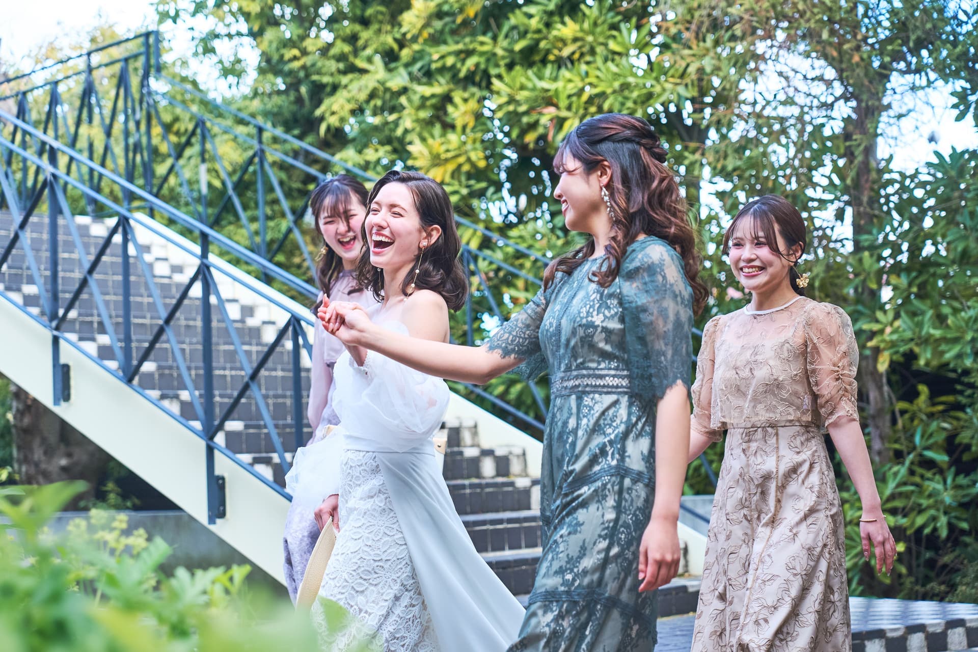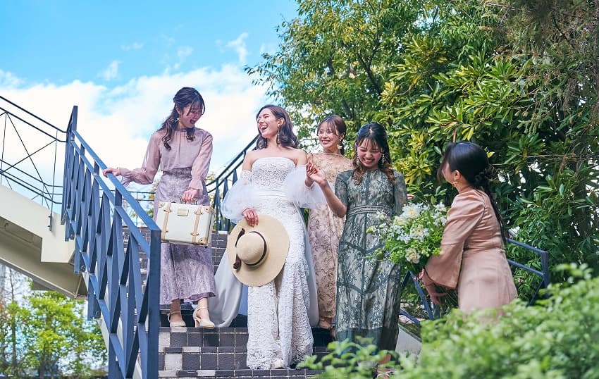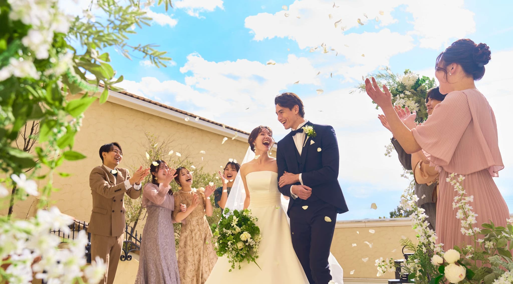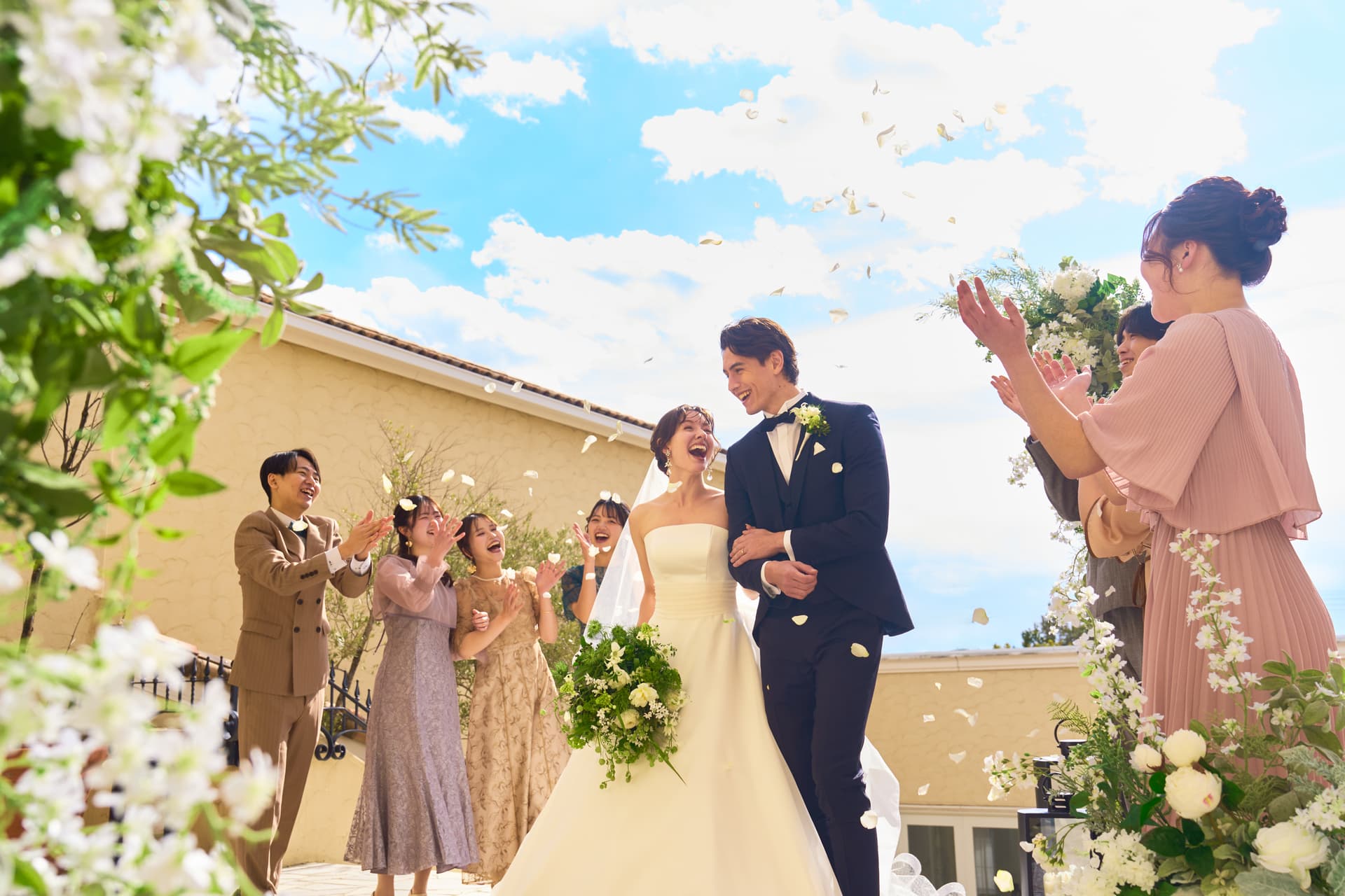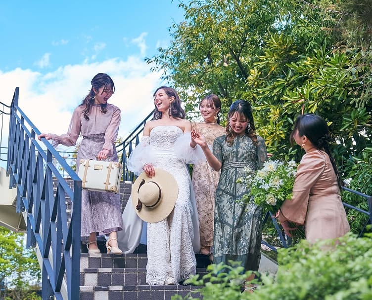 青空に映える大階段でフラワーシャワーを。