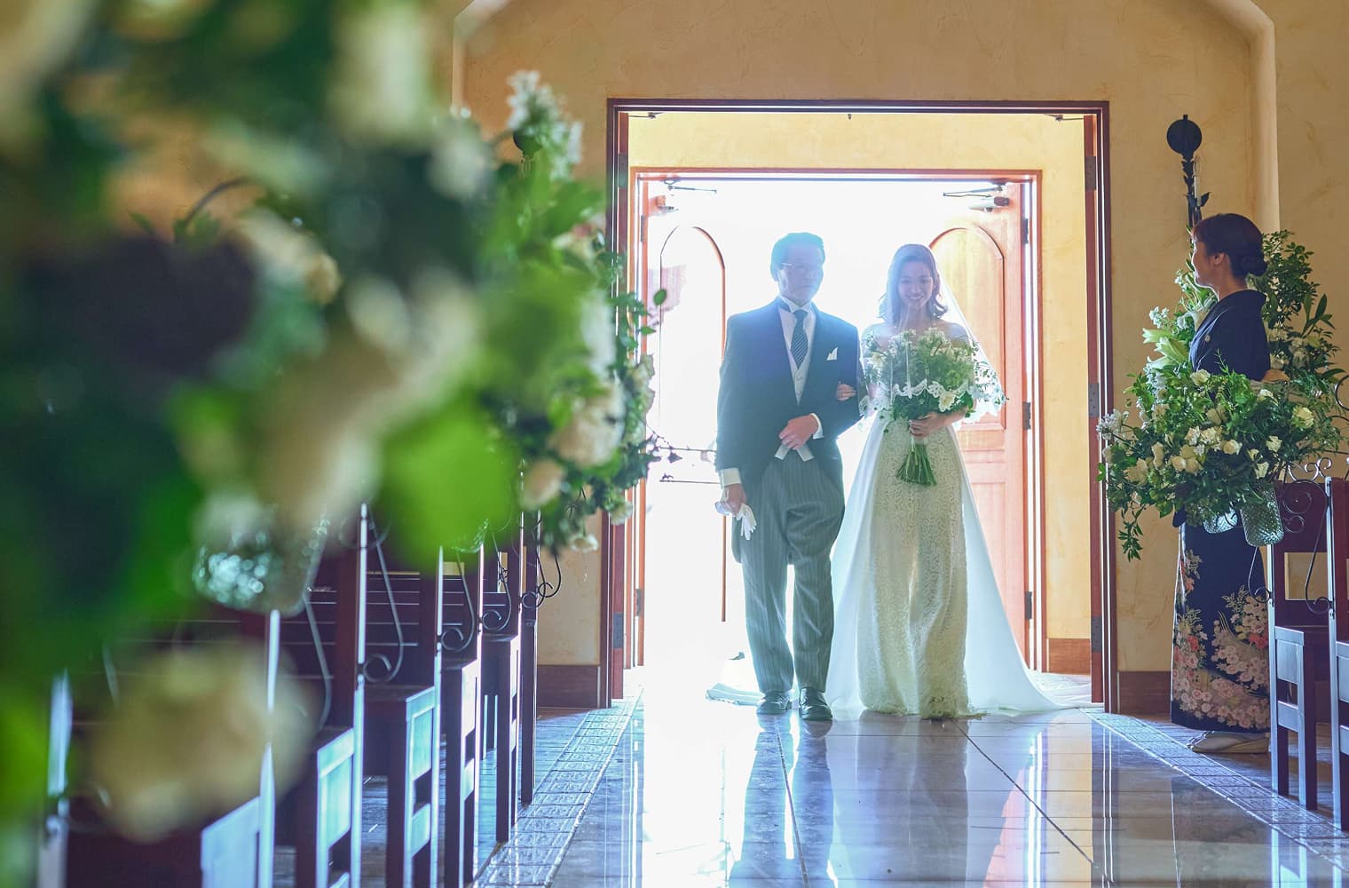 純白のドレスが一番美しく映えるよう、あえて真っ白ではなく 温かみのあるアイボリーで統一されたチャペル。 挙式後は、