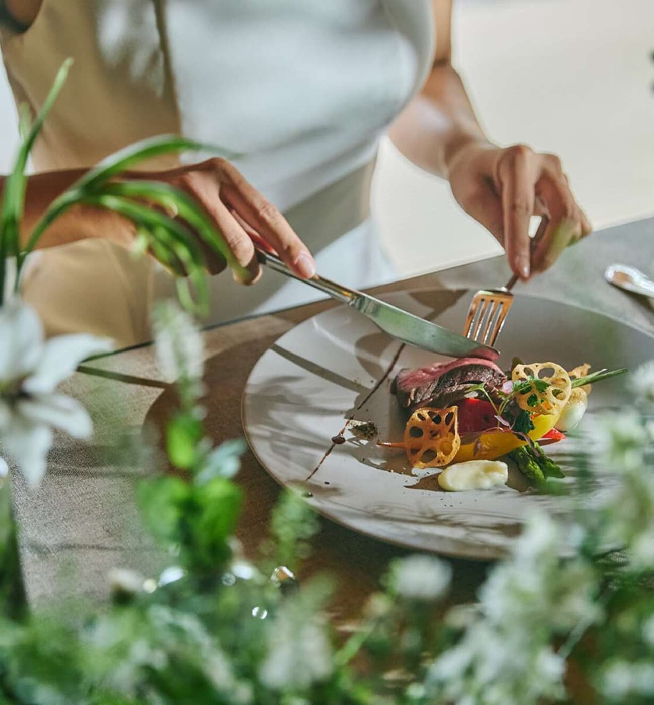 幅広い世代の方に心から喜んでいただけるよう、日本各地の厳選食材を使用し、お箸でも召し上がれる「和フレンチ」をご用意しました。オープンキッチンから届く、一番美味しい温度と香りにこだわった美食体験をお約束します。