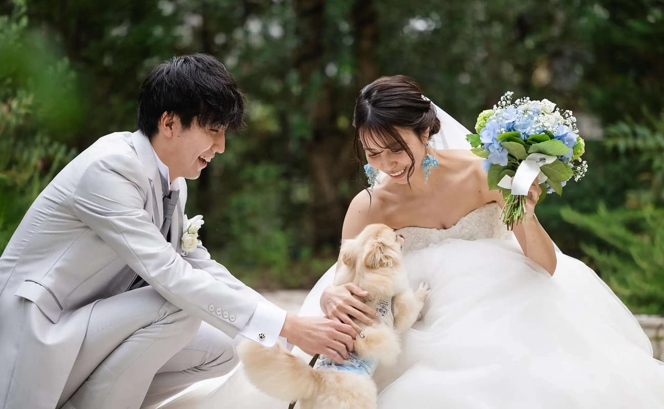 愛犬も1日中ずっと一緒に。他のゲストとすれ違わない完全貸切だから 愛犬も館内を自由に過ごせます。 挙式でのリングドッグや、中庭での写真撮影も。 大切な家族をお留守番させることなく、 一日中ずっと一緒に楽しめます。