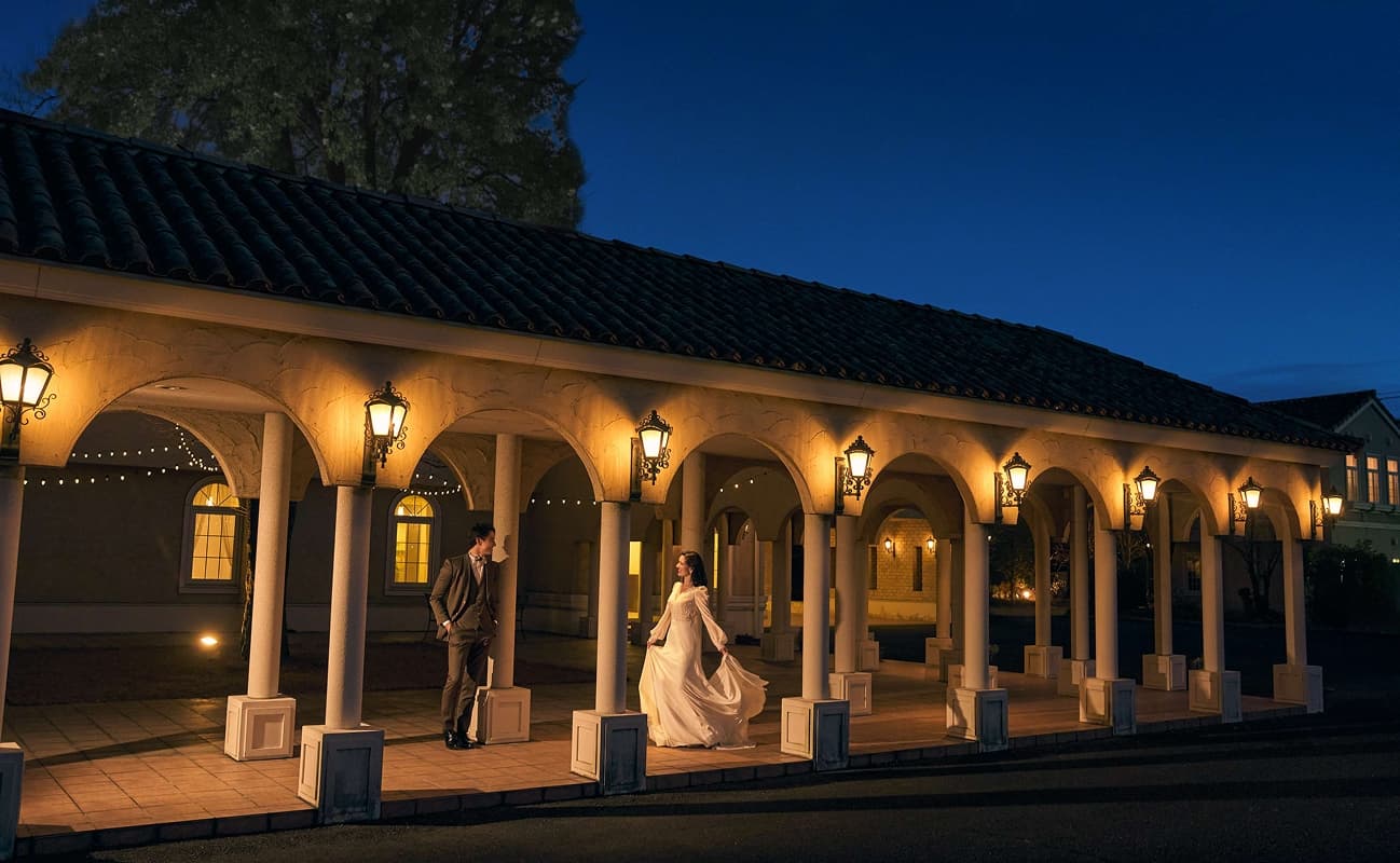 夕暮れから夜へと移ろう空の色、あたたかな灯りに包まれる幻想的な雰囲気。夕景の美しい中での後撮りや、披露宴後の二次会まで自由に楽しめるのも大きな魅力。特別な一日の感動をそのままに、余韻まで贅沢に味わえるナイトウエディングが叶います。